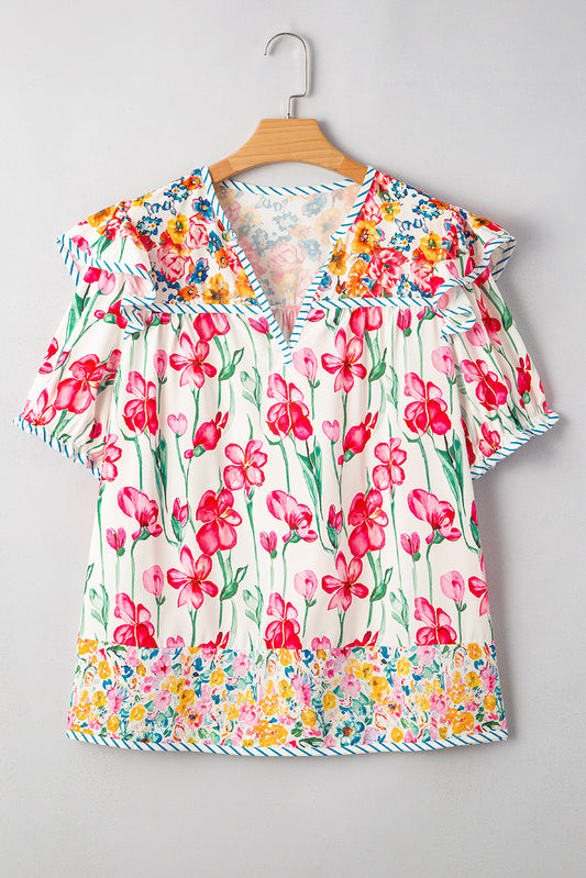 Floral Print Striped V-Neck Blouse