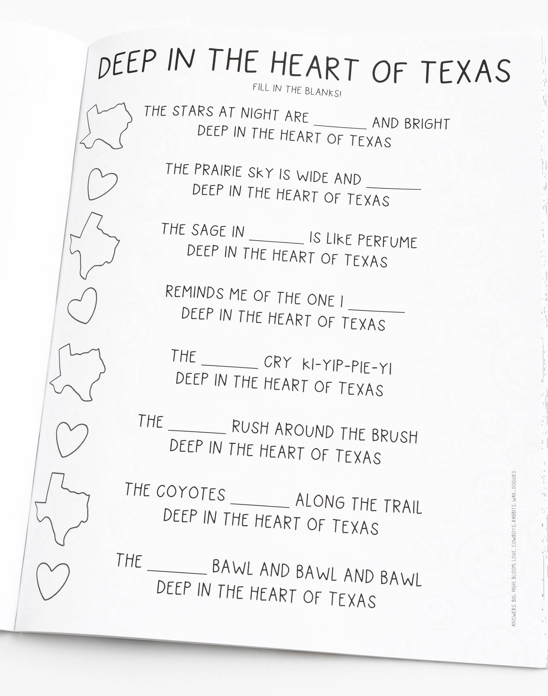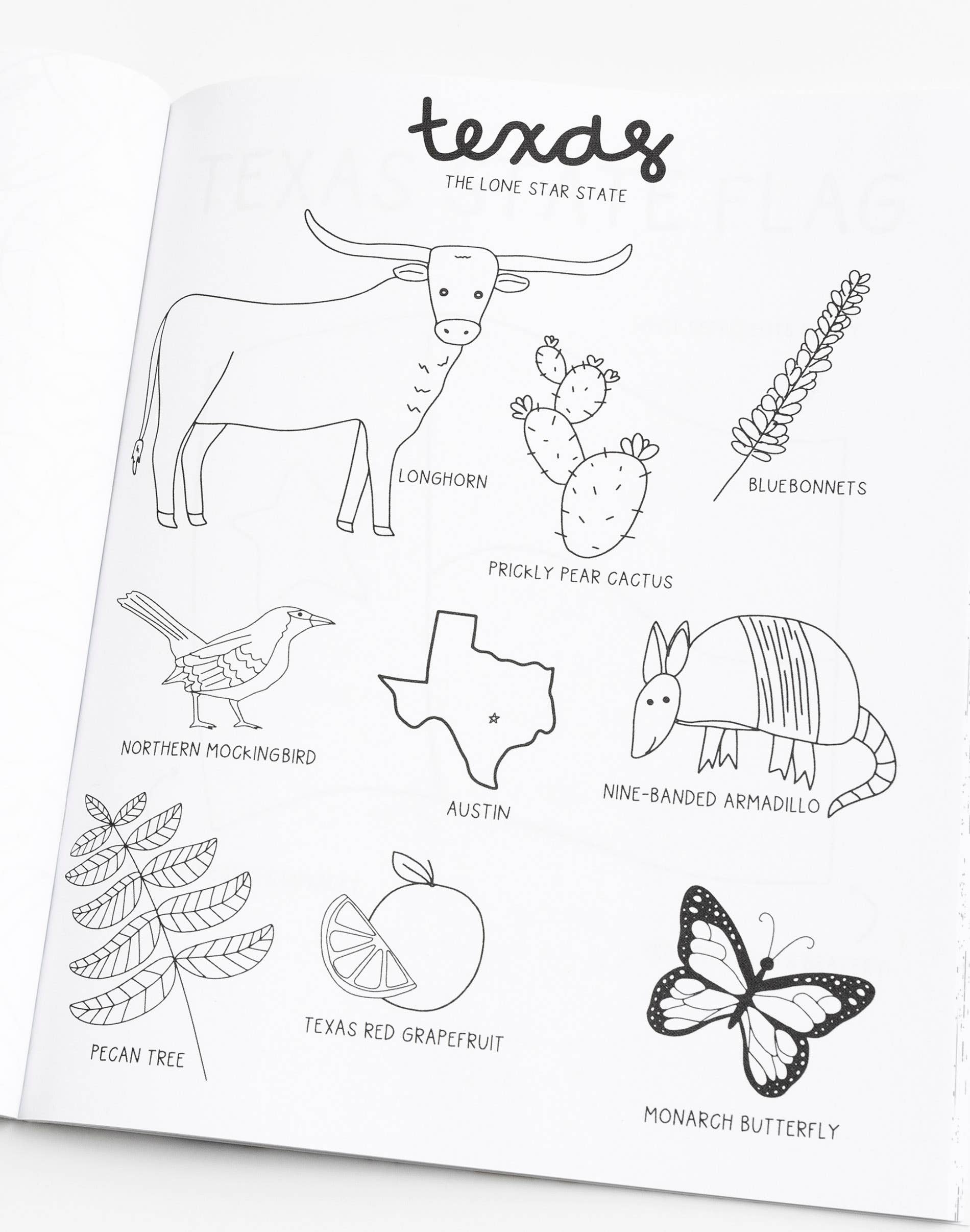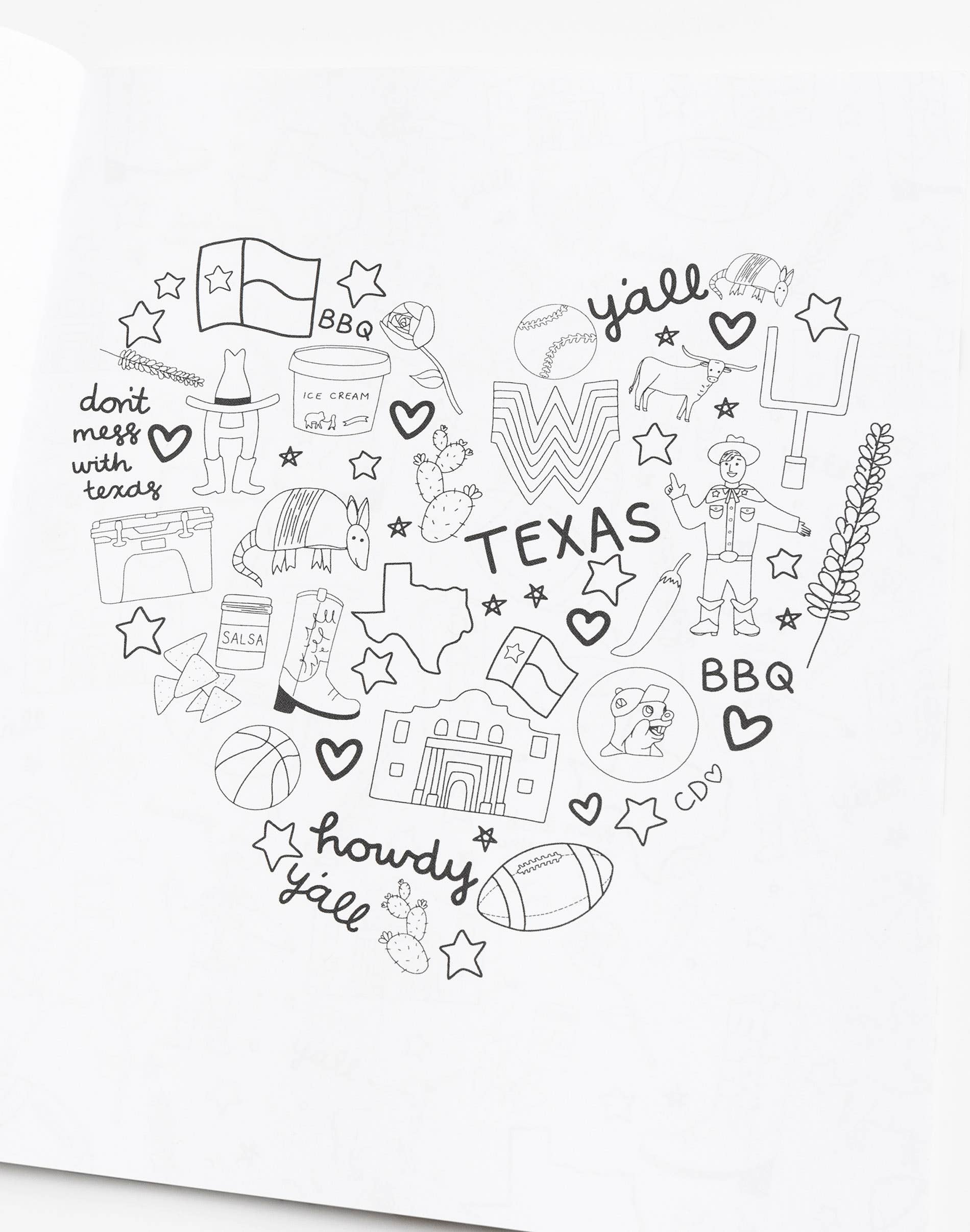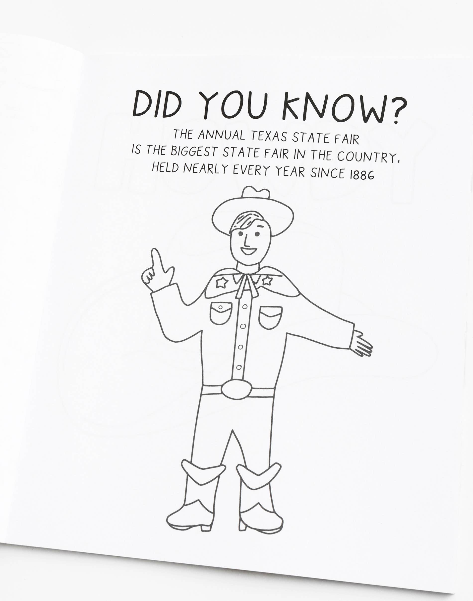 8×10 Coloring Book with 40 Pages filled with fun Texas images. Comes gift package ready with a pack of colored pencils!