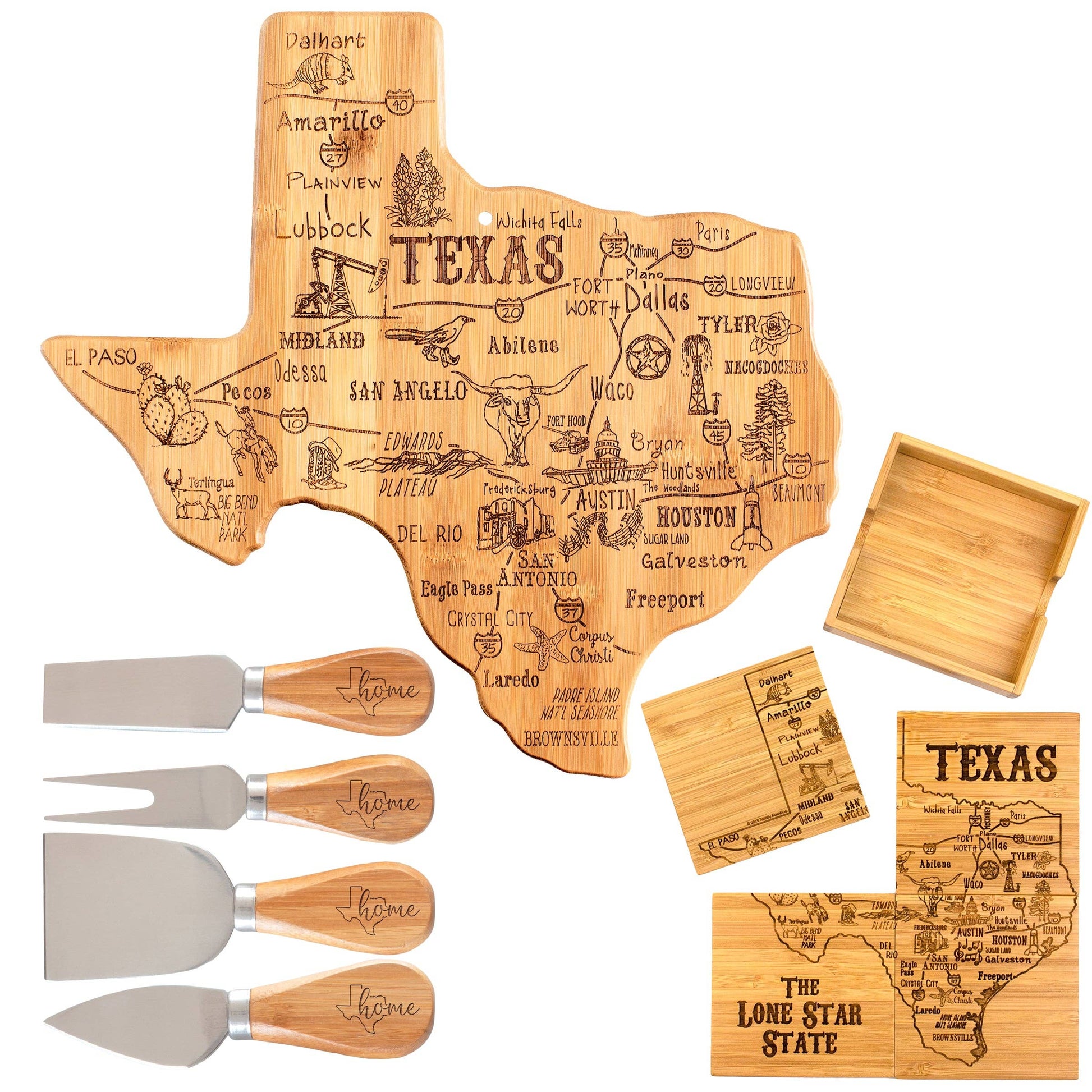 This Texas Gift Box Set by Totally Bamboo contains three favorite state gift items in one valuable gift set! The set contains a Destination Texas Cutting Board that's wonderful for serving cheese and other snacks on the engraved front, for use as a bamboo chopping board for food prep on the blank back and it's perfect for hanging as home decor when not in use with the included hang tie. To complete the charcuterie offering, the set also includes a 4-Piece Cheese Tool Set with stainless steel blades and an engraved bamboo handle calling out Texas as "home." And to round out the gift offering, the set includes a set of Texas Puzzle Coasters: four bamboo coasters engraved with state artwork and a storage case. This gift set is perfect for those that love to entertain and is a wonderful souvenir or gift for Christmas, Mother's Day, housewarmings, weddings and more!