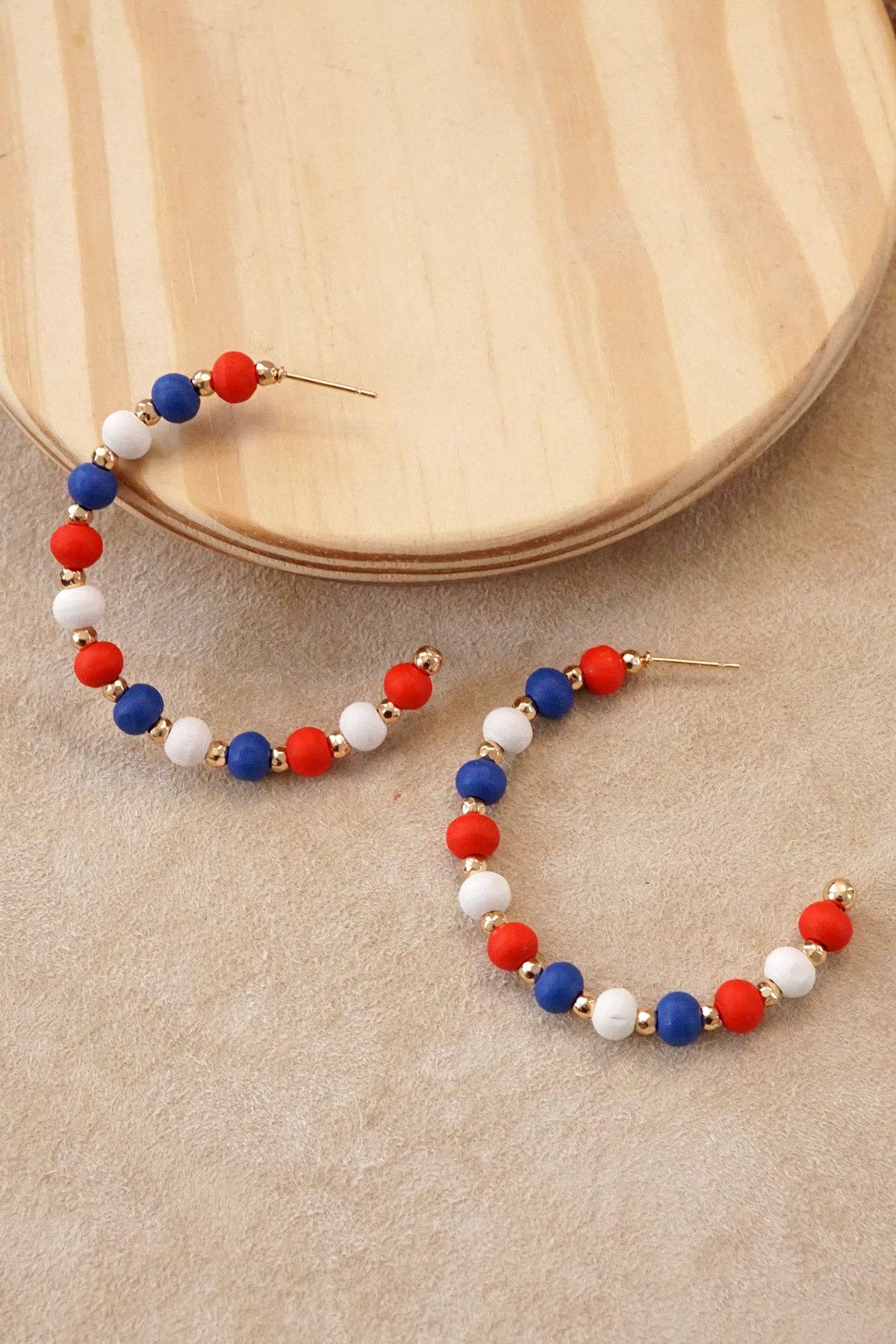 Texans Hoop Earrings Red White Blue 2" drop open hoops Red white and blue wooden beads Golden beads
